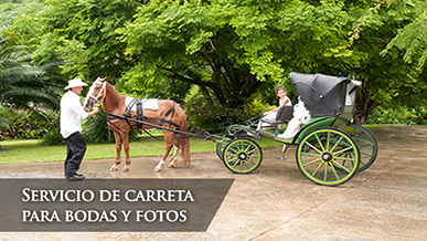 Una boda íntima no está completa sin un elegante carruaje con caballo y chofer que te llevará el dia más importante de tu vida. Permítenos añadir ese toque especial a tu boda, fiesta de graduación u otro evento para una transportación de lujo que nunca olvidarás. Excelente para secciones fotográficas, hace tu sueño de celebrar en grande, especial y con un hermoso entorno para recordar una realidad.